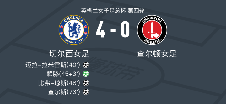 北京时间1月12日英格兰女子足总杯 第四轮,切尔西女足对阵查尔顿女足。切尔西女足迈拉-拉米雷斯破门,比弗-琼斯破门,查尔斯破门,赖滕破门。最终比分切尔西女足 4-0 查尔顿女足。