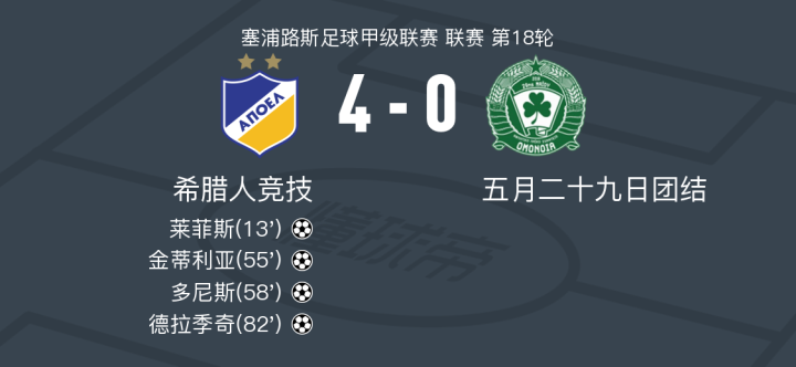 北京时间1月13日塞浦路斯足球甲级联赛 联赛 第18轮,希腊人竞技主场对阵五月二十九日团结。希腊人竞技莱菲斯破门,金蒂利亚破门,多尼斯破门,德拉季奇破门。最终比分希腊人竞技 4-0 五月二十九日团结。