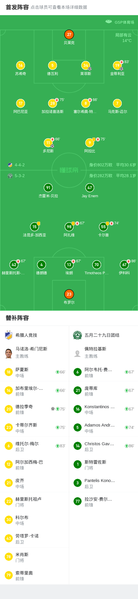 希腊人竞技4-0大胜五月二十九日团结,德拉季奇、多尼斯破门
