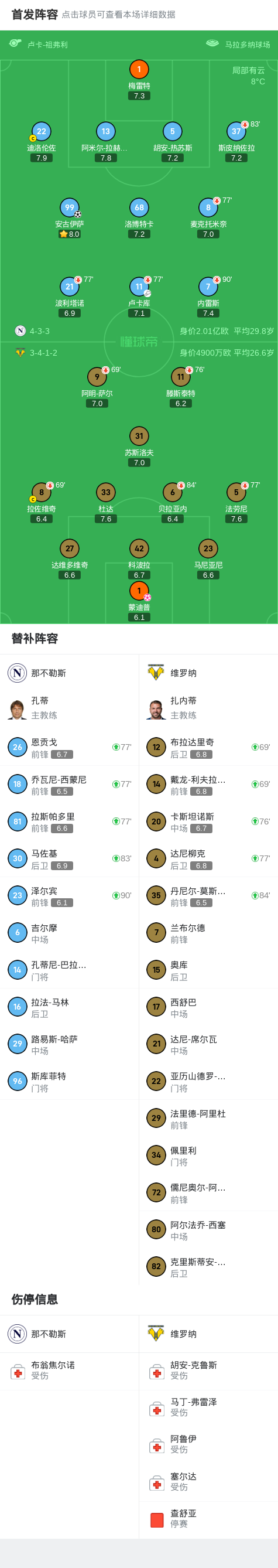 第77分钟,那不勒斯换人调整,拉斯帕多里、小西蒙尼、恩贡戈替补上场