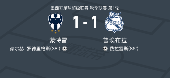 北京时间1月13日墨西哥足球超级联赛 秋季联赛 第1轮,蒙特雷主场对阵普埃布拉。蒙特雷豪尔赫-罗德里格斯破门。普埃布拉费拉雷斯破门。最终比分蒙特雷 1-1 普埃布拉。
