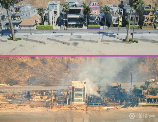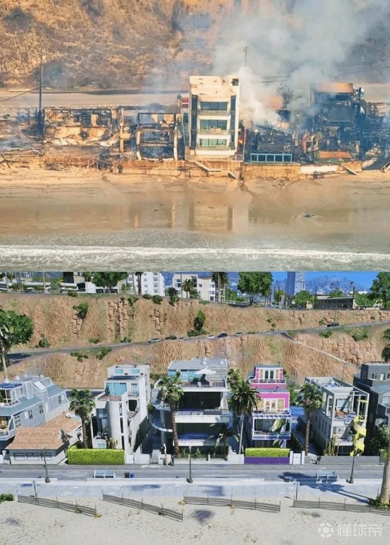 近日有国外网友表示,《GTA5》中海滨地区的房屋实地取景地已在洛杉矶山火中被烧毁,并分享了其与游戏画面的对比图:“就这样,我失去了在现实中看到它的机会。”