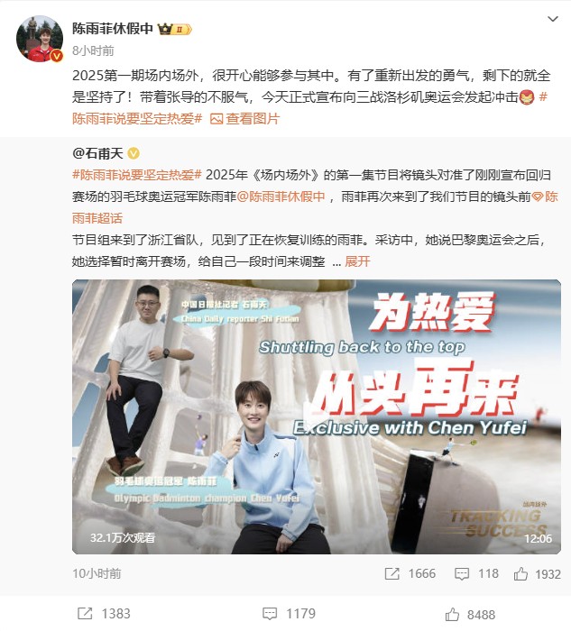 在采访播出后,陈雨菲个人微博也转发了相关视频,并表示正式宣布向洛杉矶奥运会发起冲击。