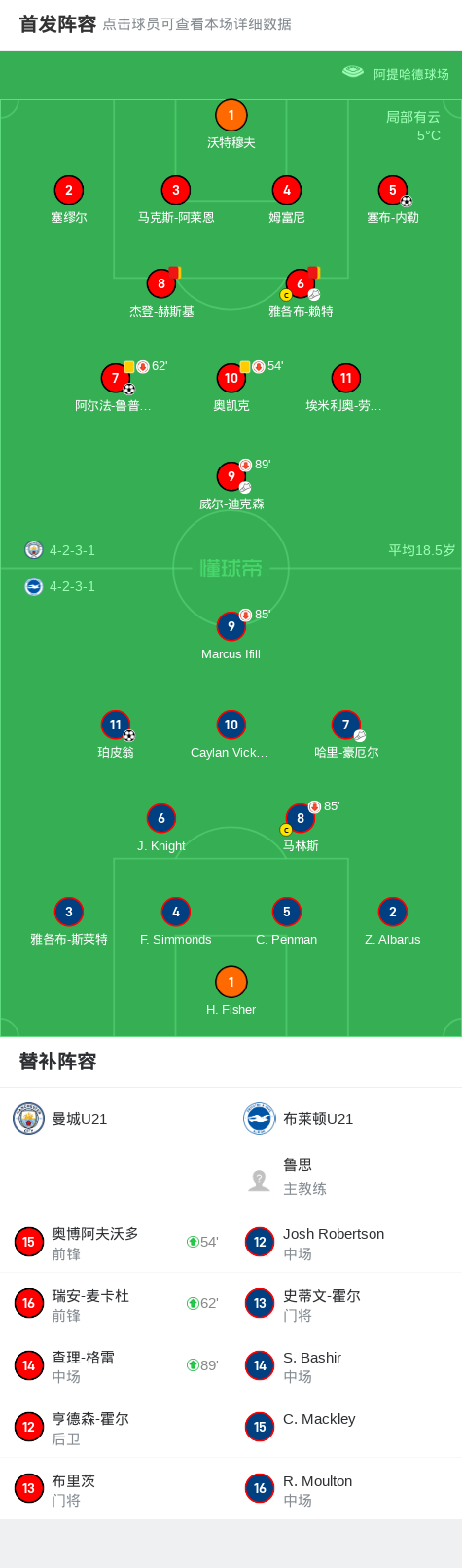 曼城U21 2-1布莱顿U21,塞布-内勒、阿尔法-鲁普雷希特破门