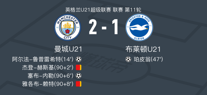 北京时间1月14日英格兰U21超级联赛 联赛 第11轮,曼城U21主场对阵布莱顿U21。曼城U21阿尔法-鲁普雷希特破门,塞布-内勒破门。布莱顿U21珀皮翁破门。最终比分曼城U21 2-1 布莱顿U21。
