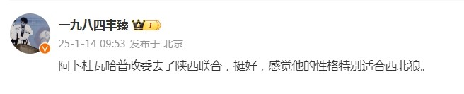 记者丰臻表示:“阿卜杜瓦哈普政委(在广州队时的绰号是‘政委’)去了陕西联合,挺好,感觉他的性格特别适合西北狼。”