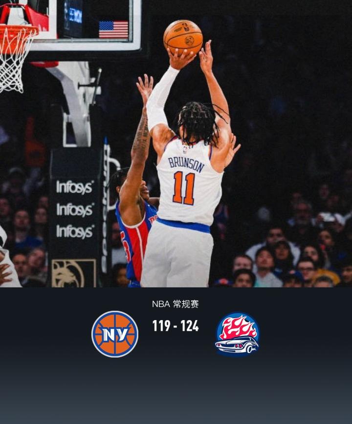 第四节尼克斯布伦森拿下12分,活塞坎宁安拿下11分,最终尼克斯119-124不敌活塞