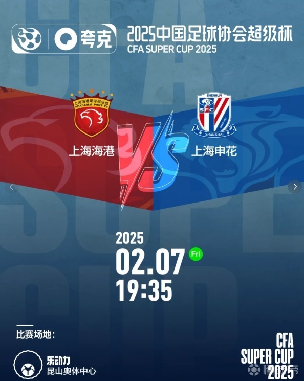 2024赛季的中超冠军、足协杯冠军上海海港和中超亚军上海申花将在乐动力昆山奥体中心体育场展开超级对决,为争夺2025年首个中国足球协会顶级赛事奖杯火力全开!