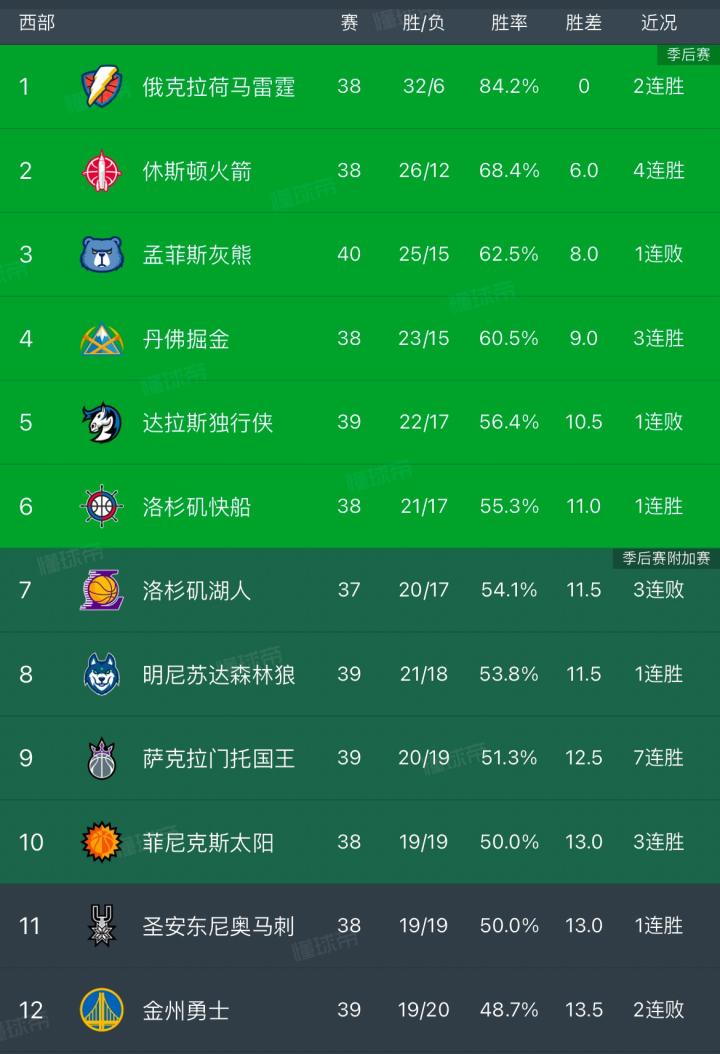 库里领衔的金州勇士状态和战绩依旧没有好转,今日输球后已跌至第十二的位置;