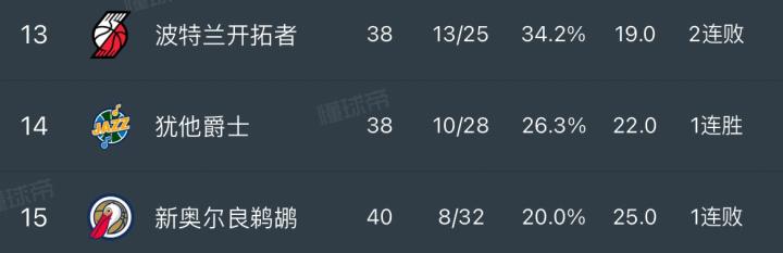 此外开拓者、爵士和鹈鹕的胜率均不到35%,排名西部后三位。
