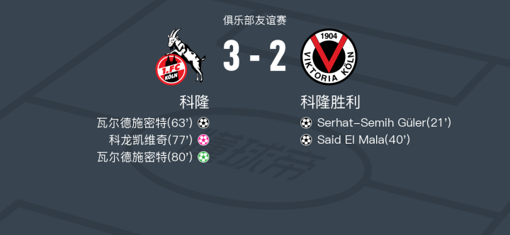 北京时间1月14日俱乐部友谊赛,科隆对阵科隆胜利。科隆瓦尔德施密特梅开二度。科隆胜利Serhat-Semih Güler破门,Said El Mala破门,科龙凯维奇自摆乌龙。最终比分科隆 3-2 科隆胜利。