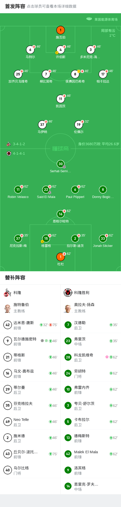科隆3-2逆转科隆胜利,瓦尔德施密特两球