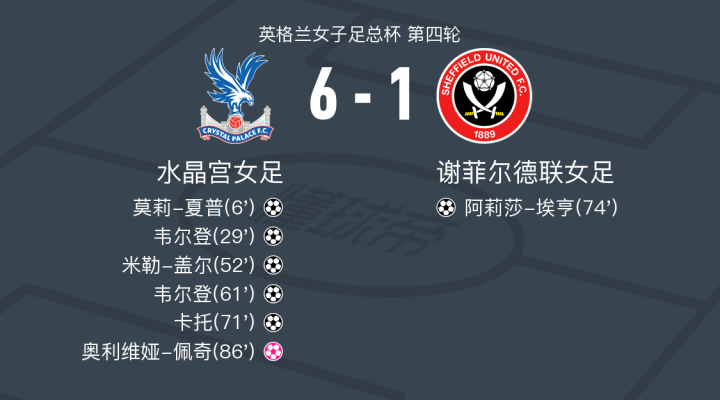 北京时间1月15日英格兰女子足总杯 第四轮,水晶宫女足对阵谢菲尔德联女足。水晶宫女足莫莉-夏普破门,韦尔登梅开二度,米勒-盖尔破门,卡托破门。谢菲尔德联女足阿莉莎-埃亨破门,奥利维娅-佩奇自摆乌龙。最终比分水晶宫 6-1 谢菲尔德联女足。