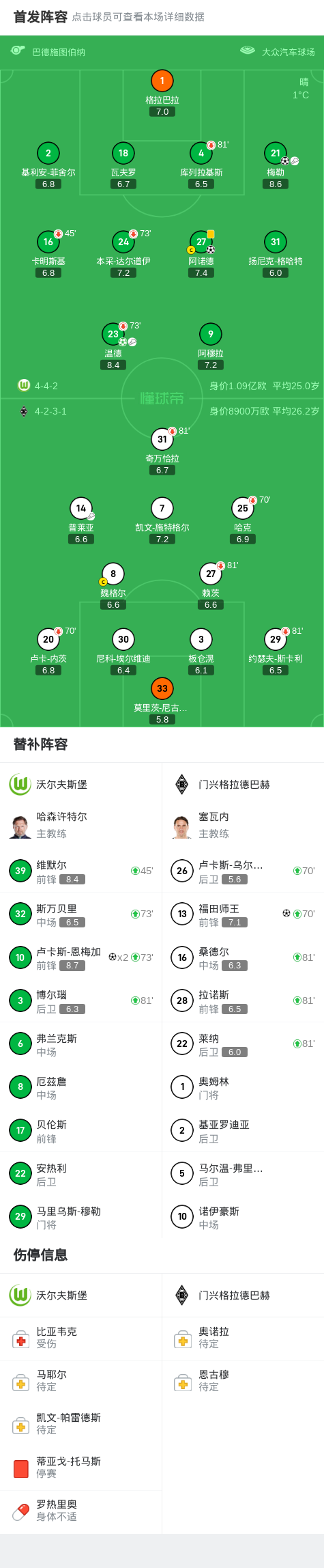 北京时间1月15日德国足球顶级联赛 联赛 第17轮,沃尔夫斯堡主场对阵门兴格拉德巴赫。沃尔夫斯堡温德破门,梅勒破门,阿诺德破门,卢卡斯-恩梅加梅开二度。门兴格拉德巴赫福田师王破门。最终比分沃尔夫斯堡 5-1 门兴格拉德巴赫。
