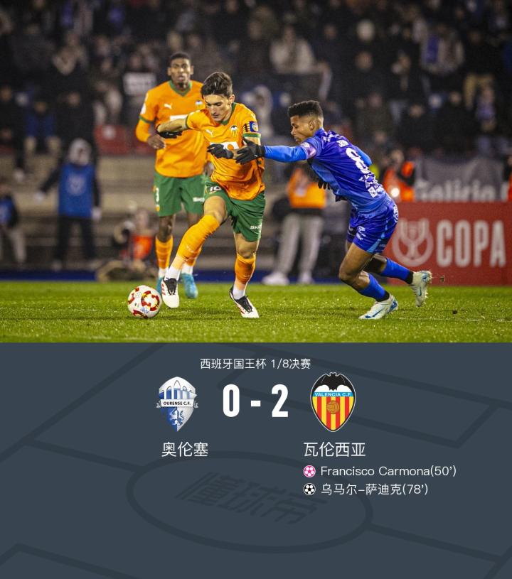 北京时间1月15日西班牙国王杯 1/8决赛,奥伦塞对阵瓦伦西亚。奥伦塞Francisco Carmona自摆乌龙。瓦伦西亚乌马尔-萨迪克破门。最终比分奥伦塞 0-2 瓦伦西亚。