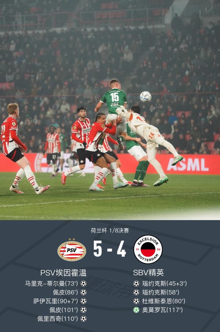 北京时间1月15日荷兰杯 1/8决赛,PSV埃因霍温对阵SBV精英。PSV埃因霍温马里克-蒂尔曼破门,佩皮梅开二度,萨伊瓦里破门,佩里西奇破门。SBV精英瑙约克斯梅开二度,杜维斯泰恩破门,奥莫罗瓦破门。最终比分PSV埃因霍温 5-4 SBV精英。