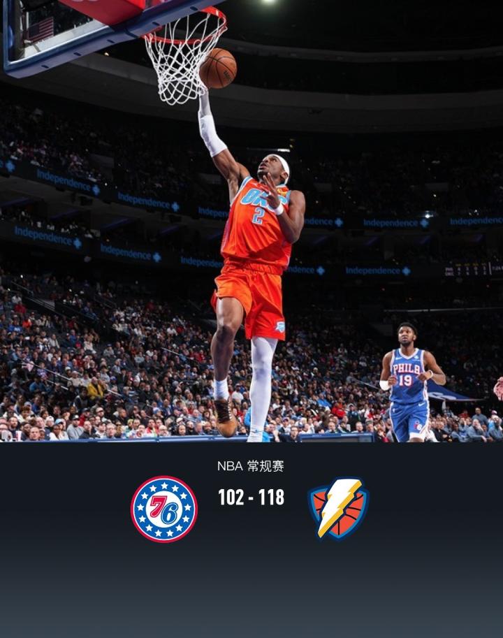 第四节76人贾斯汀-爱德华兹拿下6分,雷霆卡森-华莱士拿下11分,最终76人102-118不敌雷霆