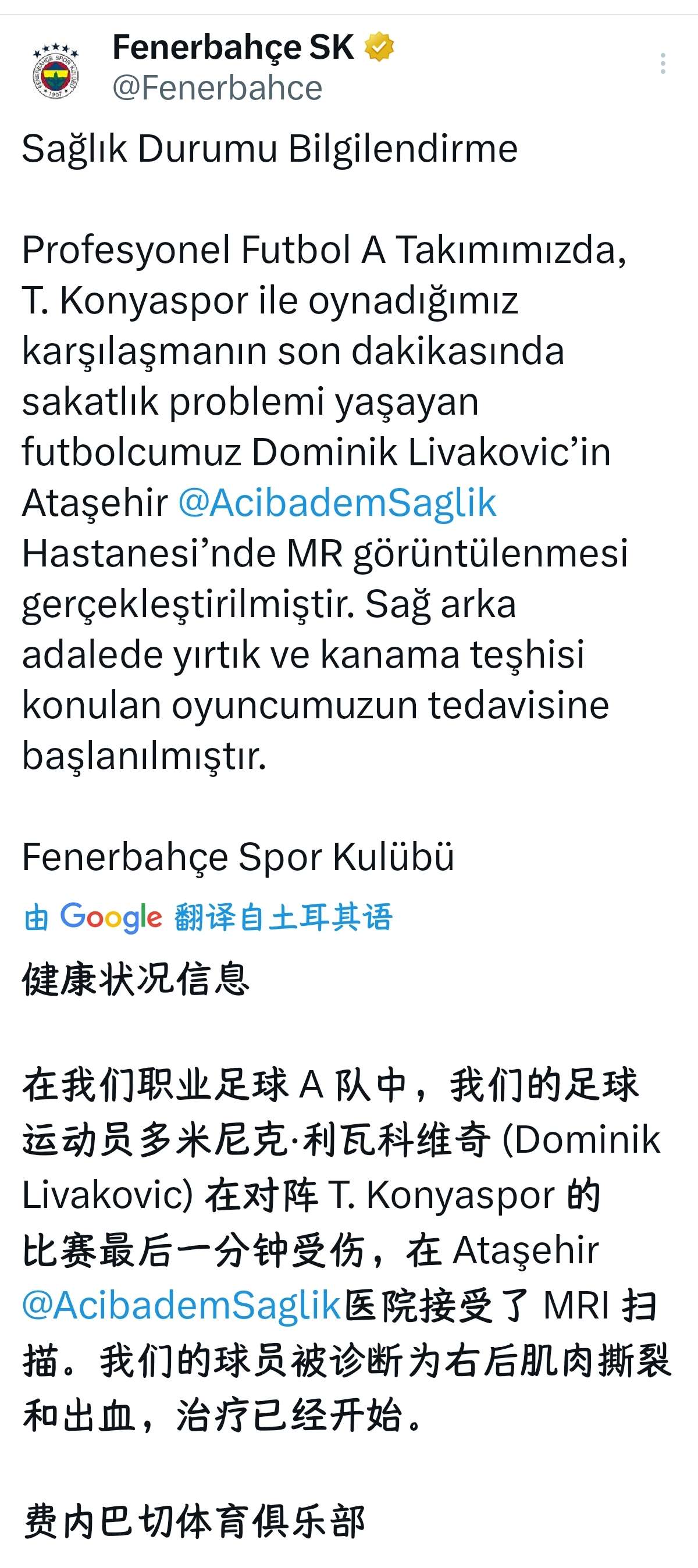 费内巴切官方宣布,我们的足球运动员多米尼克·利瓦...芳雪愁言 @懂球帝2025-01-15 22:10费内巴切官方宣布,我们的足球运动员多米尼克·利瓦科维奇(Dominik Livakovic)在对阵科尼亚体育比赛最后一分钟受伤,在Atasehir医院接受了MRI扫描,被诊断为右后肌肉撕裂和出血,治疗已经开始。展开更多