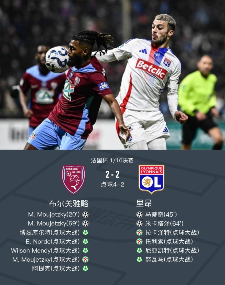 北京时间1月16日法国杯 1/16决赛,布尔关雅略对阵里昂。上半场莫捷斯基远射破门,之后里昂战术角球,马蒂奇破门。下半场谢尔基直塞,米卡塔泽破门反超比分,之后奥马里回传失误,莫捷斯基破门完成双响。点球大战中拉卡泽特、托利索罚失点球,最终里昂历经点球总分4-6被第五级别布尔关雅略淘汰。