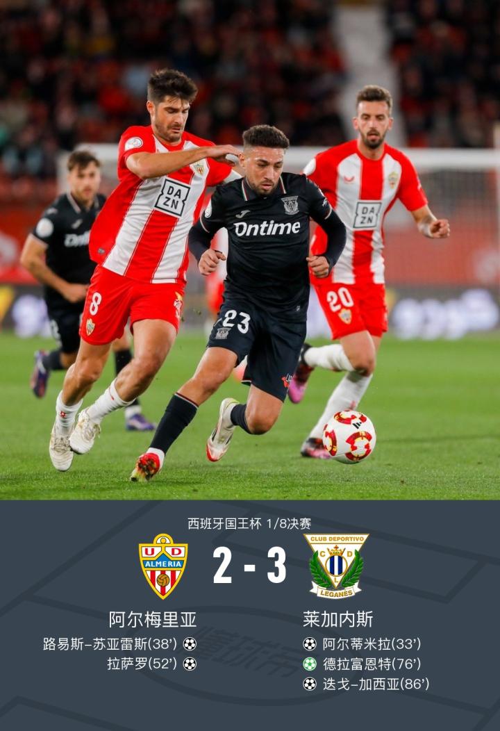北京时间1月16日西班牙国王杯 1/8决赛,阿尔梅里亚对阵莱加内斯。阿尔梅里亚路易斯-苏亚雷斯破门,拉萨罗破门。莱加内斯阿尔蒂米拉破门,迭戈-加西亚破门,德拉富恩特破门。最终比分阿尔梅里亚 2-3 莱加内斯。