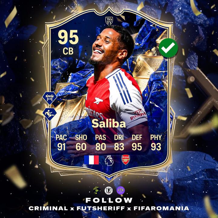 据知名FC爆料博主FutSheriff透露,萨利巴将入选《FC25》年度最佳阵容,借此,他将成为阿森纳队史首位入选者。