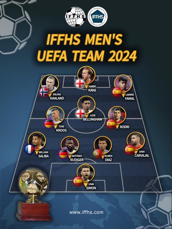 北京时间1月16日,IFFHS(国际足球历史和统计联合会)评选出了2024年度欧足联最佳阵容。
