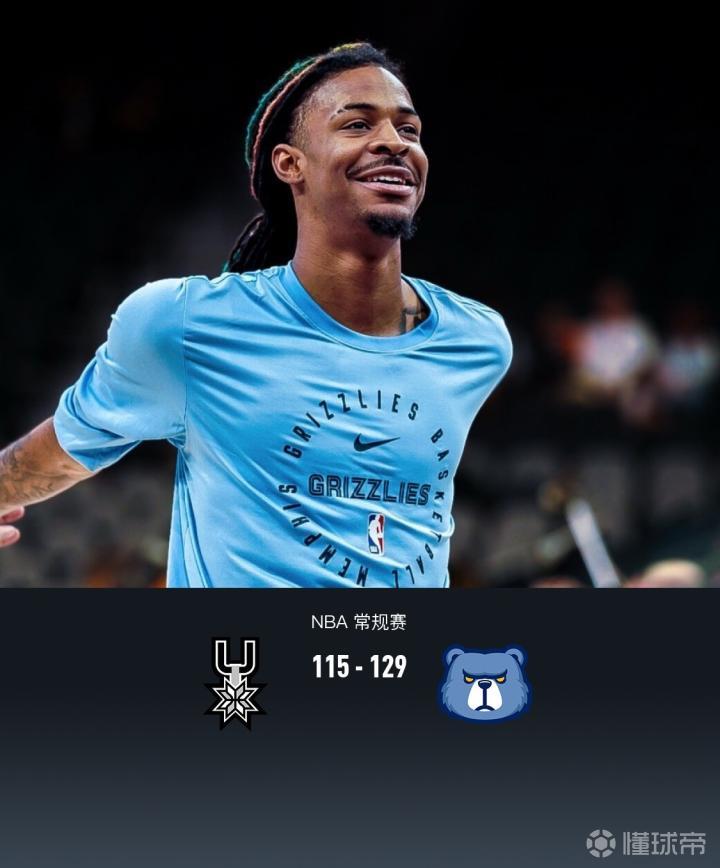 第四节马刺卡斯尔拿下15分,灰熊小贾伦-杰克逊拿下14分,最终马刺115-129不敌灰熊