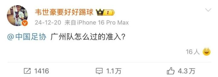 2024年12月20日,当广州队的名字出现在中国足协官方公布第二批完成债务清偿俱乐部名单仅仅几分钟后,韦世豪就在个人微博发文,并@中国足协:「广州队怎么过的准入?」