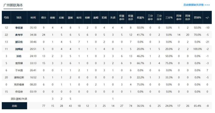 广州朗肽海本塔杰尔-麦考尔24分6板5助6断,袁照耀15分6板1助,戴维恩-沃伦13分5板1助1断;