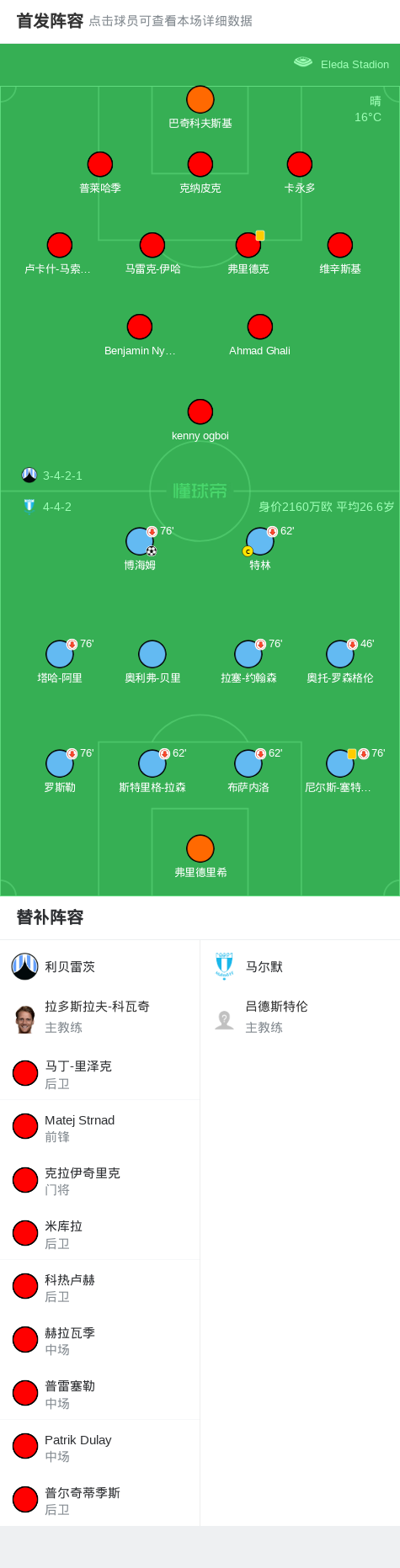 马尔默1-0利贝雷茨,博海姆一锤定音战报bot @懂球帝2025-01-17 00:23在俱乐部友谊赛中,利贝雷茨迎战马尔默。比赛中,马尔默的博海姆成功破门,为球队取得领先。最终,马尔默以1比0战胜利贝雷茨。点击查看本场比赛详细数据>>精彩瞬间第6分钟,马尔默球员博海姆打入一球。 球队阵容 技术统计 展开更多