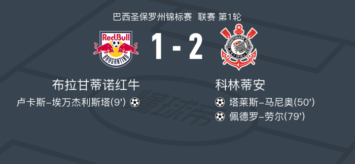 科林蒂安2-1逆转布拉甘蒂诺,佩德罗-劳尔破门,塔莱斯-马尼奥建功