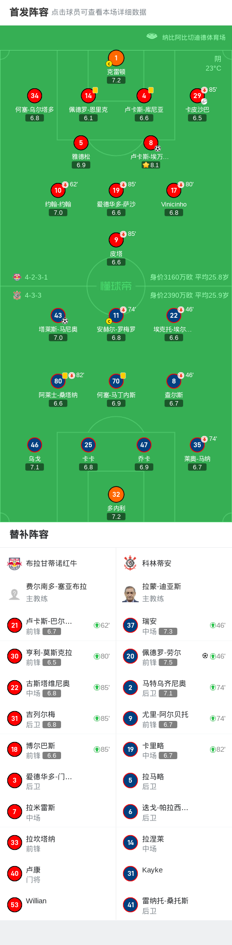 在巴西圣保罗州锦标赛的首轮比赛中,布拉甘蒂诺红牛坐镇主场迎战科林蒂安。比赛中,布拉甘蒂诺红牛的卢卡斯-埃万杰利斯塔在队友卡皮沙巴的助攻下率先破门,为主队取得领先。随后,科林蒂安的塔莱斯-马尼奥扳平比分,展现了球队的顽强斗志。比赛接近尾声时,科林蒂安的佩德罗-劳尔在瑞安的助攻下再下一城,帮助球队反超比分。最终,科林蒂安以2比1的比分逆转战胜布拉甘蒂诺红牛,取得了本场比赛的胜利。