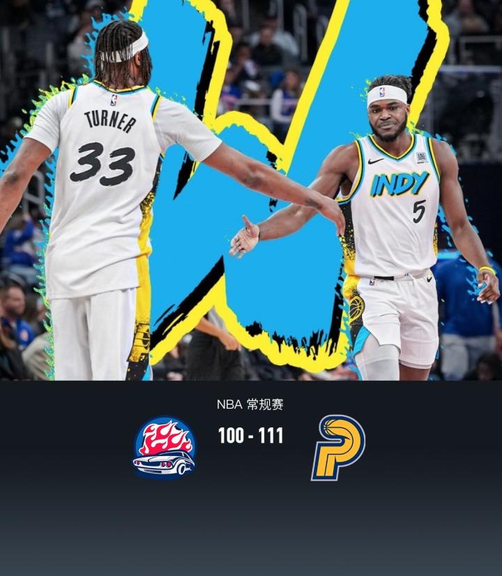 步行者111-100活塞,迈尔斯-特纳8记三分取28分,坎宁安20分4板9助