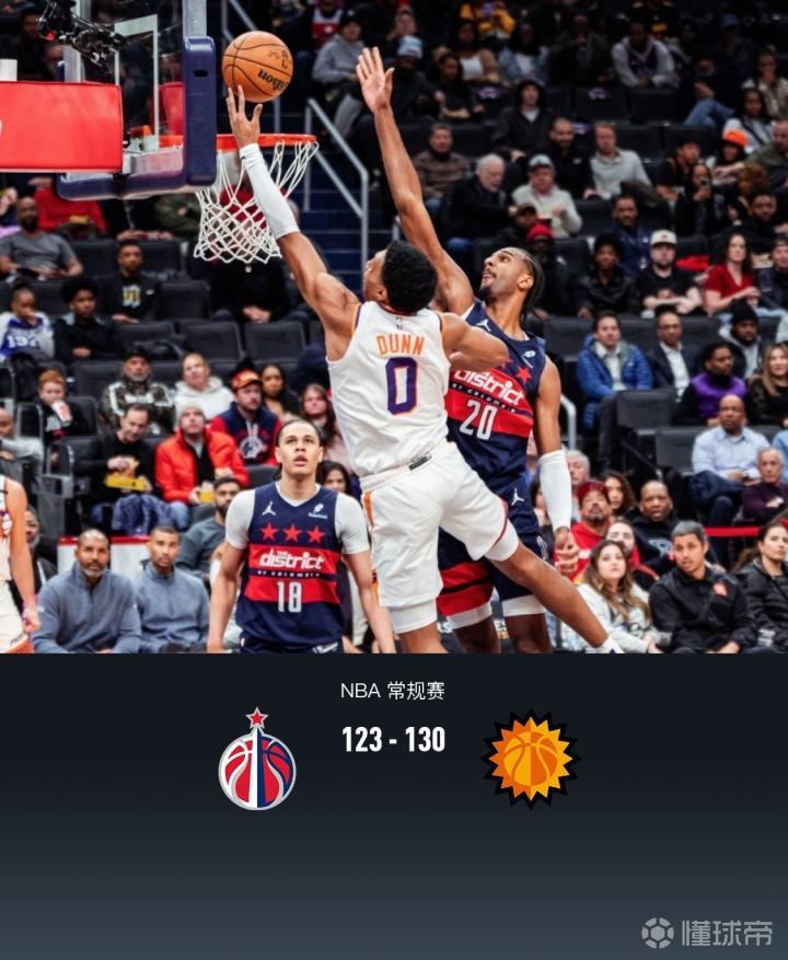 第四节奇才凯肖恩-乔治拿下10分,太阳德文-布克拿下10分,最终奇才123-130不敌太阳