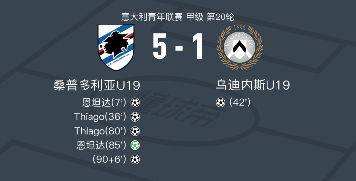 第80分钟,桑普多利亚U19球员Thiago打入一球。