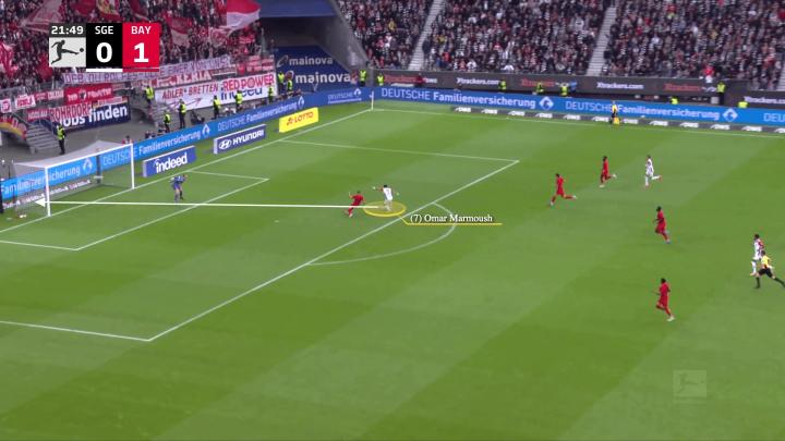 在10月法兰克福主场与拜仁3-3战平的比赛中,马尔穆什打入的第一个进球就是他对空间理解的一个例子。