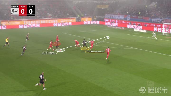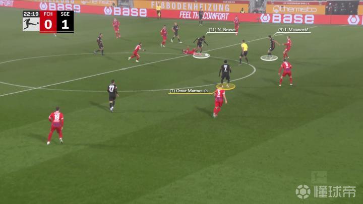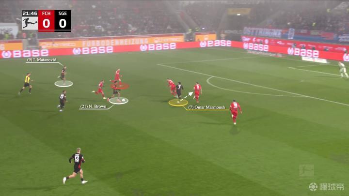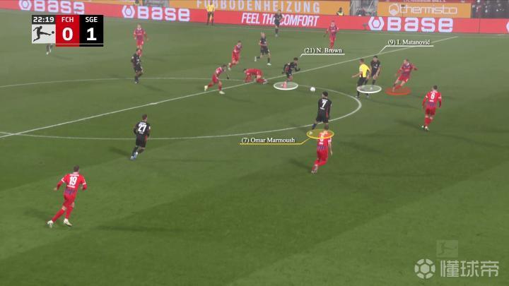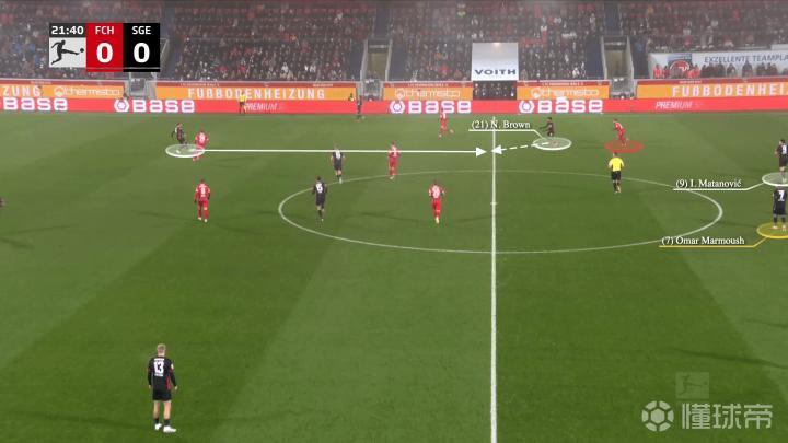 在进攻的组织阶段,马塔诺维奇和马尔穆什处于中路位置,科赫找到了在两线之间的左边翼卫纳撒尼尔-布朗,布朗的位置迫使海登海姆的右后卫马尔农-布施(红色圈)上前……
