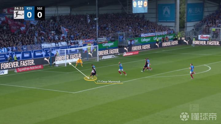 接下来的这个例子来自上个月法兰克福客场4-0战胜海登海姆的比赛中,这位埃及球员再次展示了自己在防守球员身后进行正确跑动的能力。