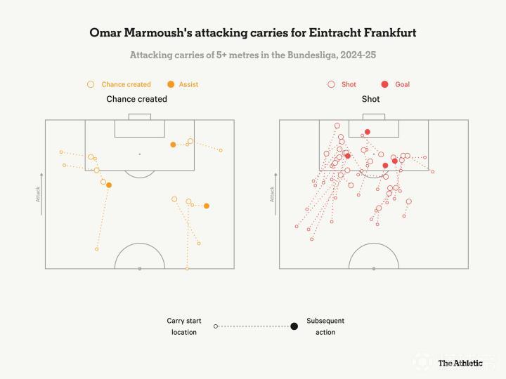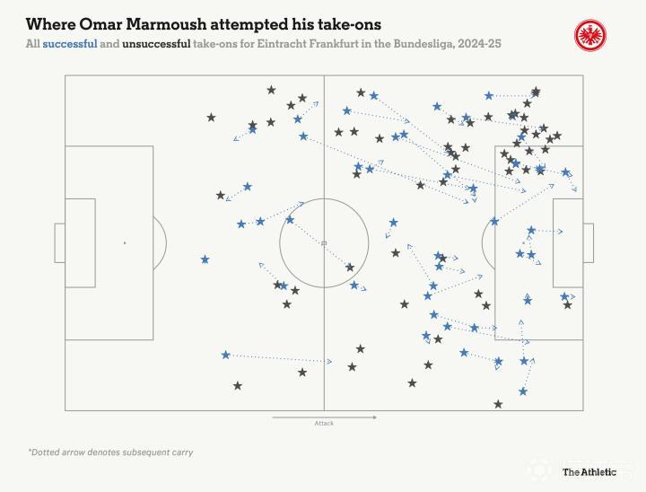 法兰克福的比赛风格和德甲攻防转换多的特点意味着马尔穆什经常能在反击时找到空间进行盘带。