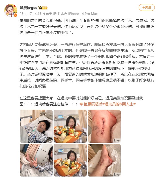 管晨辰写道:“感谢朋友们的关心和祝福,因为陈旧性骨折的伤口钢板断掉再次手术,告诫我,这次手术完一定要好好养伤。作为运动员,在训练中多多少少都会受伤,对我们来说这也是一件再正常不过的事情了。 ”