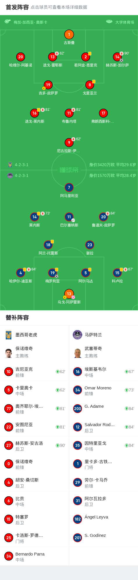 在墨西哥足球超级联赛秋季联赛的第二轮比赛中,墨西哥老虎坐镇主场迎战马萨特兰。比赛中,墨西哥老虎的赫苏斯-加尔萨率先为球队取得进球。随后,马萨特兰的乌戈-冈萨雷斯不慎自摆乌龙,进一步扩大了主队的领先优势。然而,马萨特兰并未放弃,巴尔塞纳斯助攻梅罗利亚成功破门,为球队扳回一城。最终,墨西哥老虎以2-1战胜马萨特兰,取得了比赛的胜利。