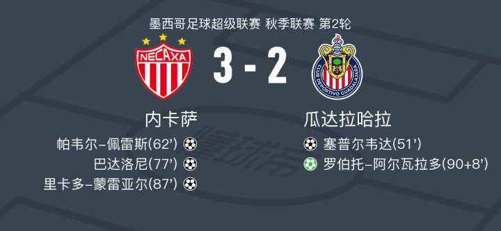 内卡萨3-2逆转瓜达拉哈拉,里卡多-蒙雷亚尔、巴达洛尼破门