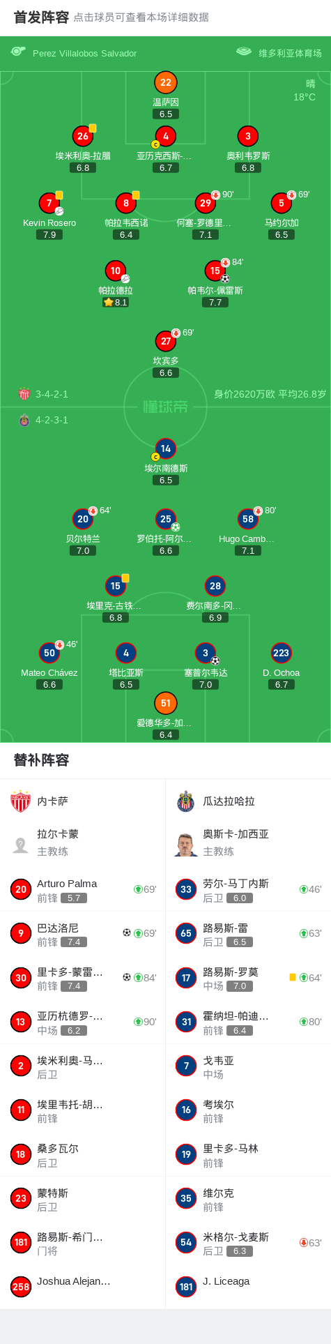第62分钟,内卡萨球员帕拉德拉助攻帕韦尔-佩雷斯打入一球。