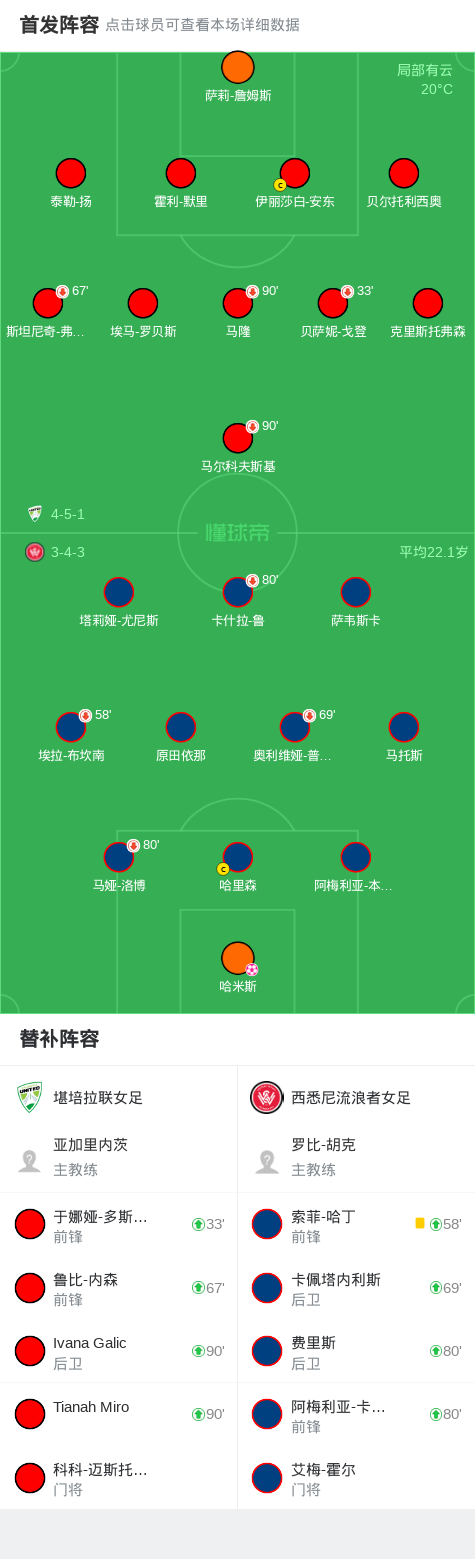 第45分钟,西悉尼流浪者女足球员哈米斯自摆乌龙。