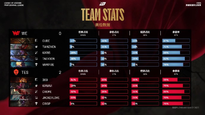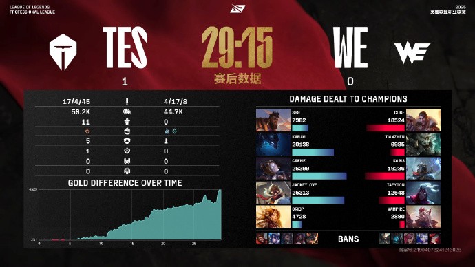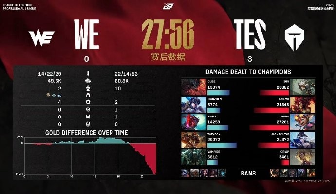 第27分钟,TES击杀WE野辅,随后在高地陆续击杀WE多人后拆掉基地结束比赛,22-14。