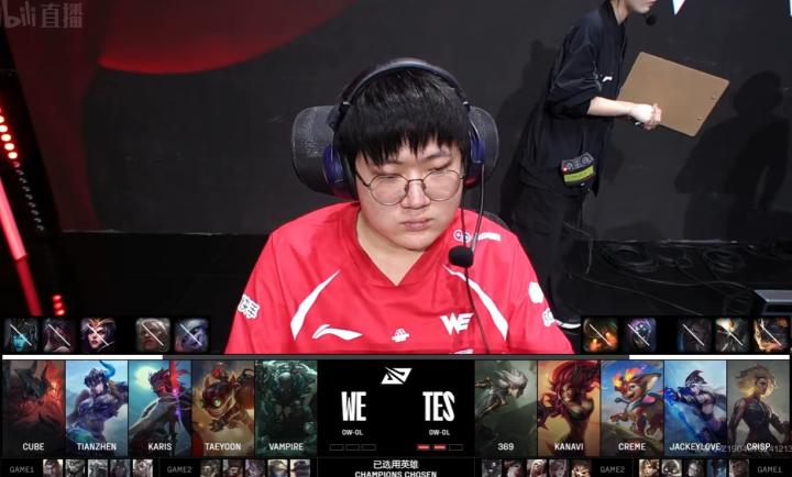 第6分钟,WE野辅在河道击杀Crisp,Vampire拿到一血,0-1(TES在前)。