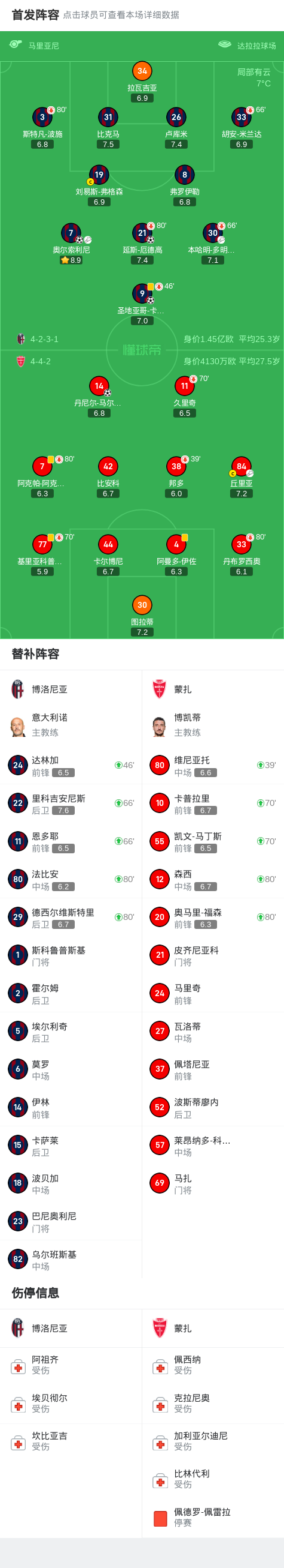在意大利足球顶级联赛第21轮的较量中,博洛尼亚坐镇主场迎战蒙扎。比赛中,蒙扎的丹尼尔-马尔蒂尼率先取得进球,为球队打开局面。然而,博洛尼亚迅速做出回应,奥尔索利尼助攻圣地亚哥-卡斯特罗扳平比分。随后,本哈明-多明格斯的精彩传球帮助延斯-厄德高反超比分。比赛接近尾声时,里科吉安尼斯再次送出助攻,奥尔索利尼锁定胜局。最终,博洛尼亚以3-1战胜蒙扎,取得了本场比赛的胜利。
