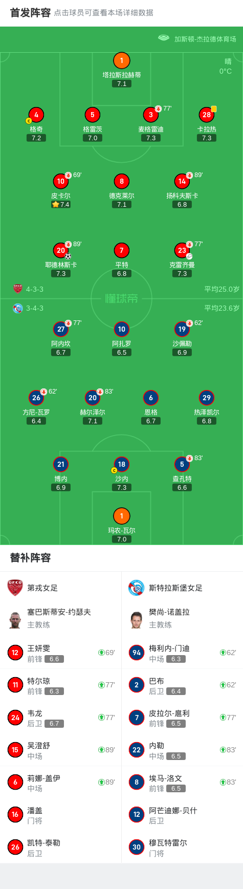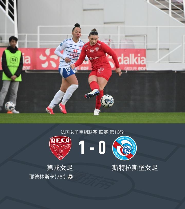 在法国女子甲组联赛第13轮的比赛中,第戎女足坐镇主场迎战斯特拉斯堡女足。比赛中,第戎女足的克雷齐曼送出精彩助攻,耶德林斯卡成功破门,为球队取得领先。最终,第戎女足以1-0战胜斯特拉斯堡女足,取得了本场比赛的胜利。