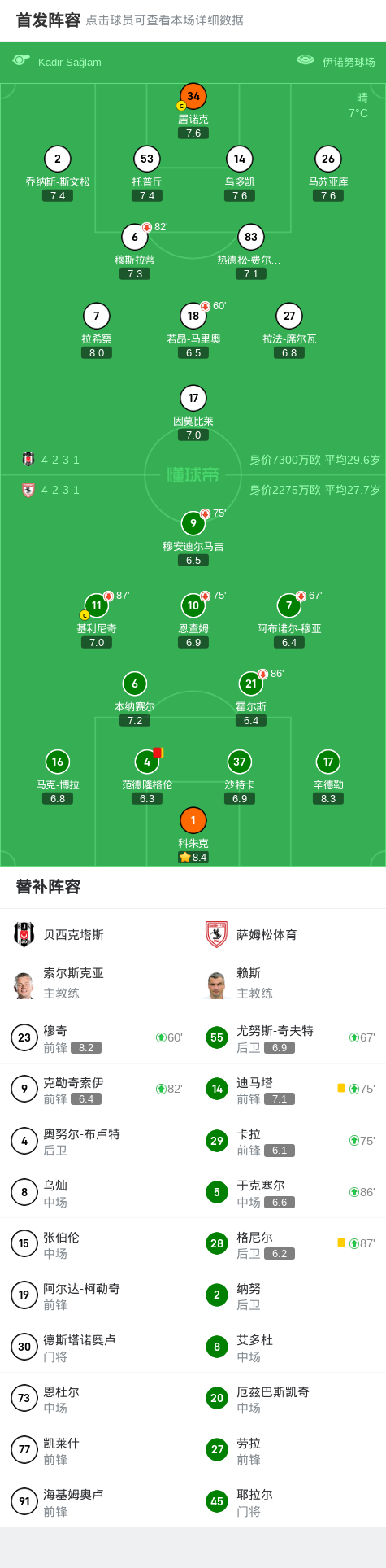 贝西克塔斯0-0萨姆松体育,科朱克力保城门不失