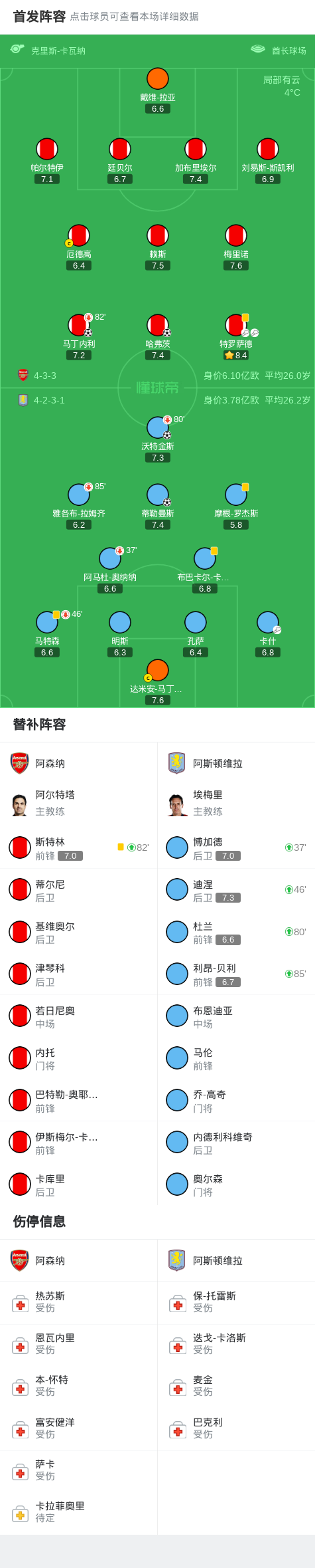 北京时间1月19日01:30,英超第22轮焦点战,阿森纳坐镇主场酋长球场迎战阿斯顿维拉,本场主裁判为克里斯-卡瓦纳。上半场,特罗萨德传中助攻马丁内利抢射破门。下半场,特罗萨德又助攻哈弗茨破门,随后维拉凭借蒂勒曼斯和沃特金斯的进球连扳两城追平;终场前,哈弗茨将梅里诺的打门挡入网窝,因手球被判无效。最终,阿森纳主场2-2战平维拉。
